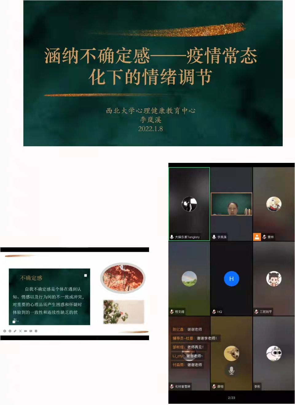 1月8号,化材学院邀请到西北大学心理健康教育中心的李岚溪老师为学院师生在线上作了《涵纳不确定感》专题心理讲座,旨在帮助学生调节疫情常态化下的情绪,以积极向上的状态度过这段时间。学院全体学工干部、学生心理骨干、全体在校生共同参加了本次讲座。